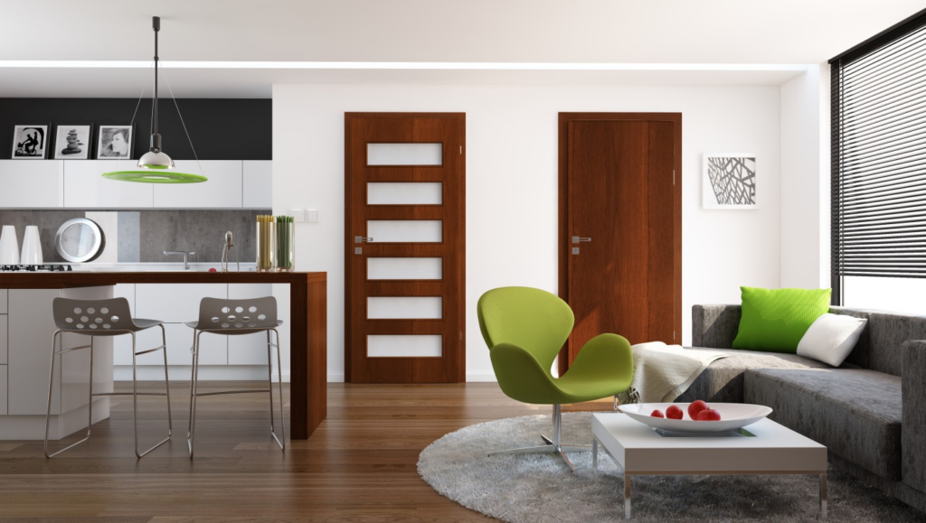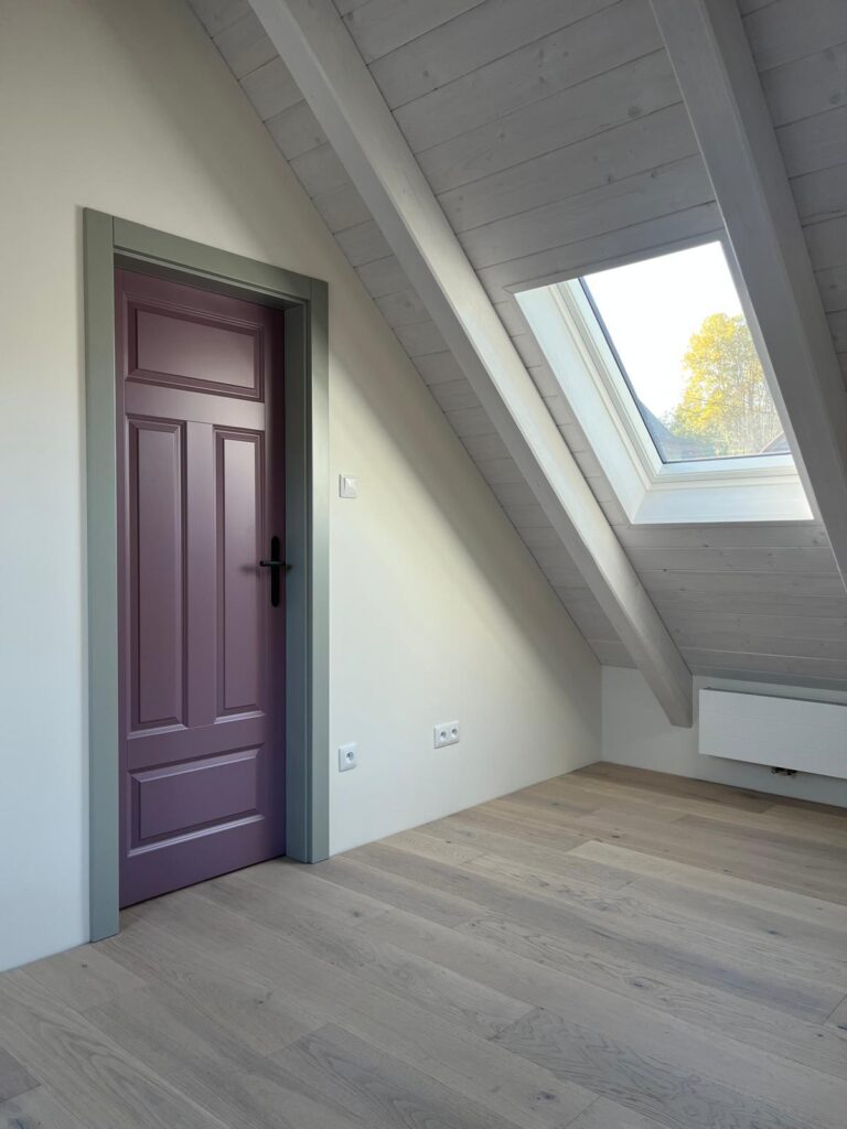 Pro tento rodinný dům jsme realizovali interiérové dveře D+M v kombinaci modelů Fiord a Modern, lakované v odstínu RAL 4009 (fialová) s doplňujícími zárubněmi v RAL 7038 a posuvným systémem MP. Výsledkem je výrazné, ale zároveň velmi vyvážené řešení, které dodává interiéru osobitý charakter.