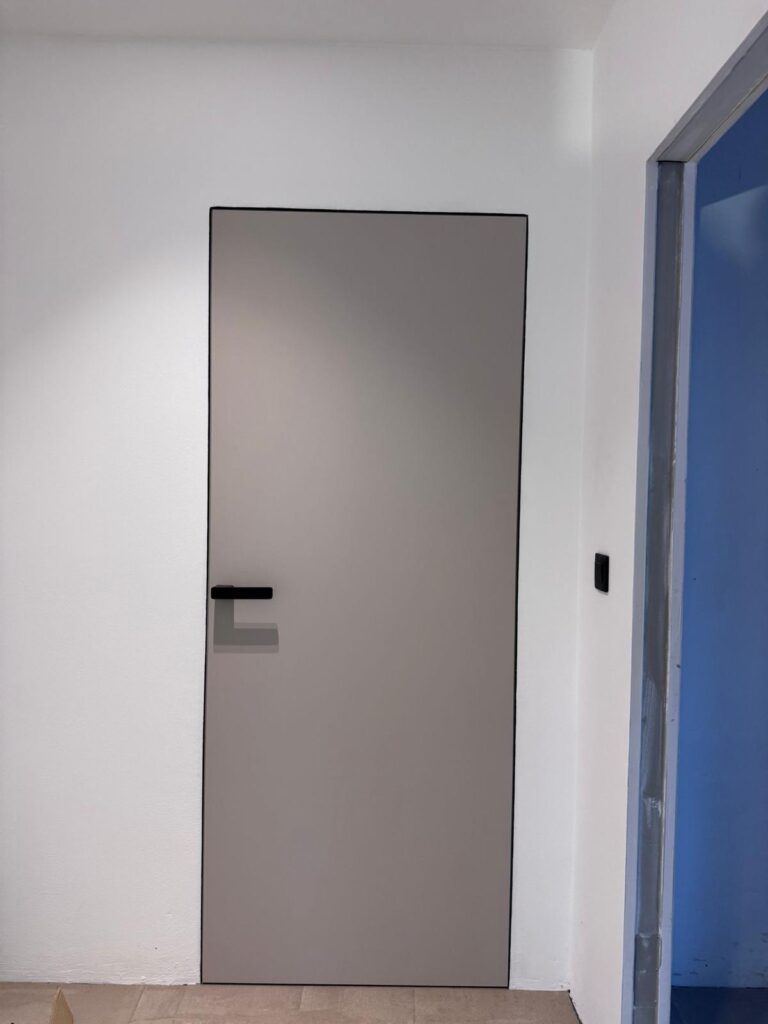 Harmony (POL-SKONE) se skrytou zárubní, v elegantní kombinaci RAL 9005 (černá) pro zárubeň, béžová Unimat pro dveřní křídla a kování Cobra. Výsledkem je moderní, architektonicky čisté řešení, které podtrhuje minimalistický charakter interiéru a zároveň působí velmi sofistikovaně.