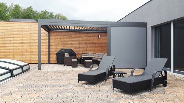 Pergola umožňuje regulaci osvětlení a větrání, její střešní lamely se totiž dají otáčet podle aktuálního počasí. Pokud je slunečno a teplo, lze lamely nastavit do úhlu, který propouští přirozené světlo a umožňuje tak snadné větrání prostoru. Pokud se ochladí nebo začne pršet, lze lamely jednoduše uzavřít a vytvořit tak krytý prostor. To je ideální pro rodinné grilování nebo setkání s přáteli venku i při nepříznivém počasí.