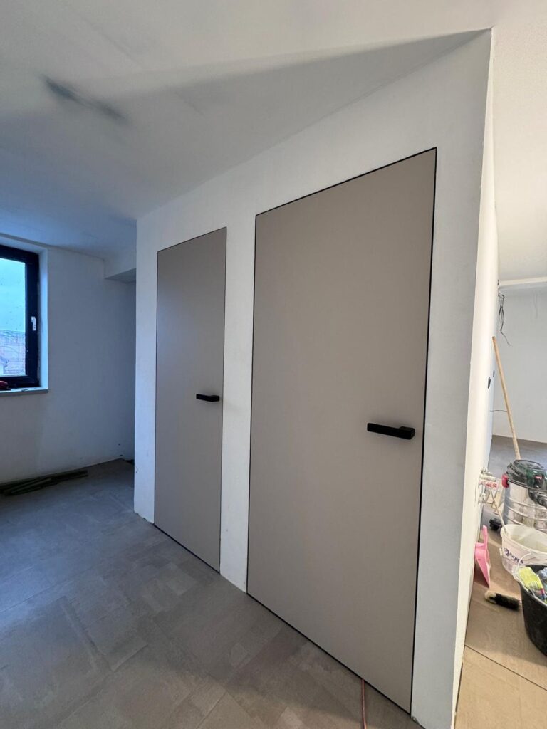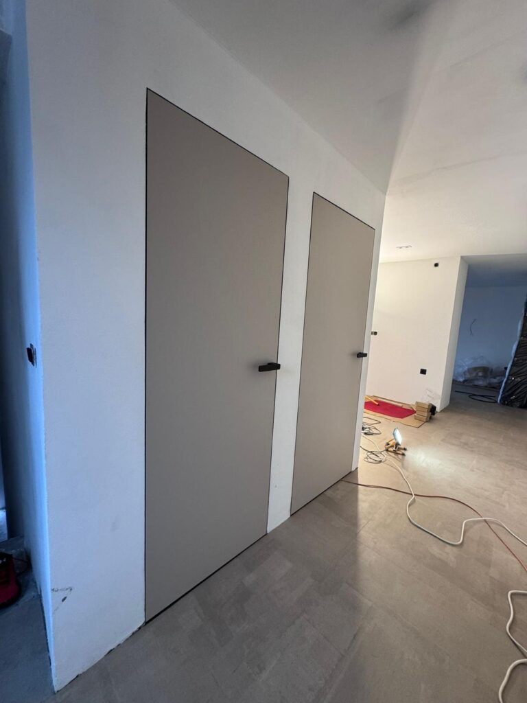 Hlavním designovým prvkem této realizace je právě skrytá zárubeň, která umožňuje, aby dveře vizuálně splývaly se stěnou. Díky tomu nevznikají rušivé přechody a prostor působí kompaktně a vzdušně. Kontrast mezi tmavou zárubní RAL 9005 a jemným béžovým povrchem dveřních křídel dodává interiéru hloubku a eleganci, zatímco kování Cobra celý koncept sjednocuje a doplňuje.